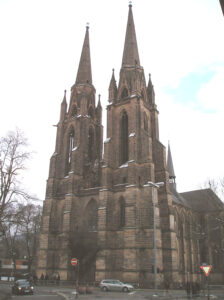 Marburg, Elisabethkirche, 1234-83: (angefangen im Chor) erste Halle in der deutschen Gotik (?), Langhaus dreischiffig, sechs Joche, zweigeschossig, Reimser Detailformen, die westlichen drei Pfeilerpaare Amienser Pfeilerkämpfer [10]