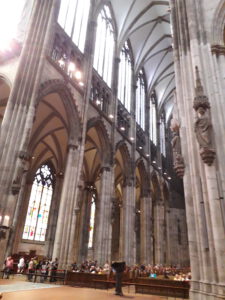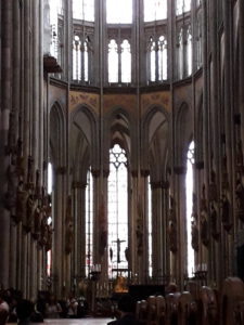 Köln, Dom, 1247-1322, Umgangschor mit 7 Kapellen, 7/12-Schluß (Meister Gerhard (1248-1270), Arnold (1270-vor 1308), Johannes (1308-1331)), Amienser Einfluss; Langhaus 5 schiffig, 6 Joche, longitudinal; Querhaus 3 schiffig, 5 Joche, Einfluss Ste-Chapelle in Paris [10]