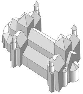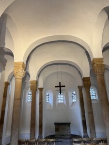 Hildesheim, St. Michael: Benediktiner, 996: Doppelchor-Basilika mit nieders. Stützenwechsel, 2 Querhaus, 2 Vierungstürme, 1010: sw-Treppenturm; 1015: Marienaltar in der Krypta, 1033: Schlussweihe. Erhalten: Deckenmalerei [1]