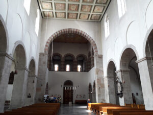 Trier, Dom St. Peter: (Spätantike: Hallenkirche); 920-93: dreischiff. Langhaus, Seitenschiffemporen, doppelgesch. Andreaskapelle. Erhalten: kreuzförmige Pfeiler (989-99 d), Westwerk (1040) [1]