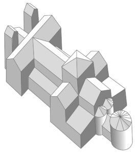 Köln-Deuz, St. Heribert, 1003: Außen rund, Innen oktogonal mit sechs Nischen. Westbau wohl dreitürmig. Tuffstein auf Basaltfundament. Erhalten: Fundamentplatte [12]