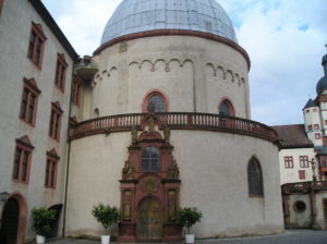 Würzburg, Marienkirche auf der Festung: Um 1000: Zentralbau, 2 gesch. Rundbau; ¼ 11. Jh.: 3 schiff. Hallenkrypta, 6 Pfeiler [1]