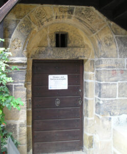 Memleben, Klosterkirche: 975 gegr.: 3 schiffig, Doppelchor-Basilika, 2 Querhäuser, 2 angefangene Krypten. Erhalten: Reste der Westapsis, südli. Seitenschiff mit Fensater und Portal („Kaisertor“) [5]